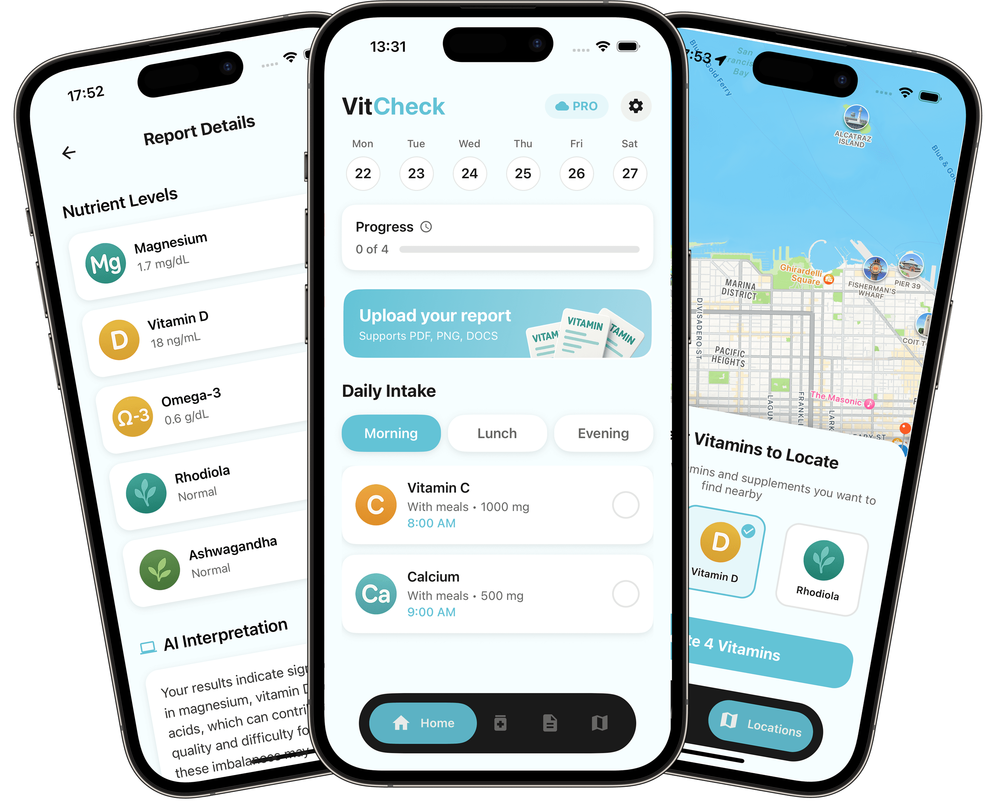 Upload a blood test as a PDF or photo. VitCheck reads the report and pulls out the vitamin and mineral values automatically, so you don’t have to search through pages of numbers.